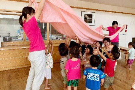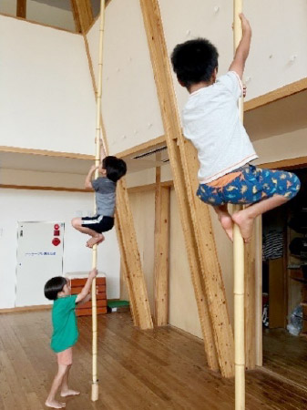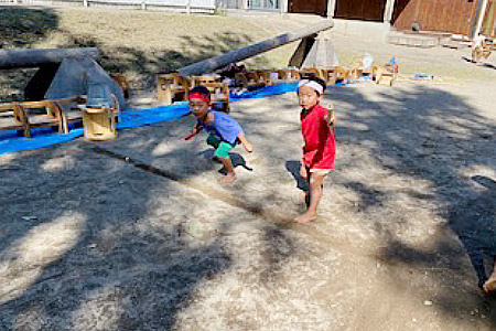 一人では難しくても仲間と一緒に乗り越えていきます。大縄はリズムがなかなか取れず何度も転び、床にぶつかり青あざを作っても挑みます。逆上がりは一人が出来ると「こうだよ」と教え合い、戸板では玲良、理大朗が「手が痛いね」「ちょっと皮がむけている」と手を見せ合い登れない玲良の足を理大朗が抑えて手伝ってきました。とび箱では、一度飛べた灯矢が飛べなくなり何日もかかって飛び越せるようになると、まだ飛べない菜緒の小先生になり、この日は夕方も「とび箱やりたい」と菜緒。他の子は外に遊びに行きましたが灯矢はずっと付きっ切りで「ここに手をつくのさ」「こわくないよ」「見てて、こうやって飛ぶのさ」と教えます。その励ましに応えるように何度も何度も挑み、みごと飛び越し喜び合いました。
