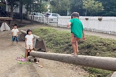 「ワッショイワッショイ」と何が始まるかと思えば、運動会の障害物で行う平均台を自分たちで板を運び、コンテナにおいて上手に渡る子どもたち。最初は恐る恐るカニ歩きで渡っていた野ノ葉も何回も遊んでいるうちに左右交互に足を出して渡れるようになりました。新は「ヒコウキワタリー」と早歩きで渡り、一生は「オチタラワニニタベラレルー」とワニごっこが始まりました。そのうち前から渡ってきた子と「ジャンケンポン!アイコデショ!マケタラオリルンダヨ」と友だちとジャンケンが始まります。かけっこもかに組の注目ポイントです。諒は海で砂浜を走る諒を見たお母さんが走ることが楽しくなって欲しいとかもめに来る前に毎朝ふれあい公園でじゃれつきをしながら走ってそれから歩いて登園しています。お父さんやお母さんとキャーと声を出して楽しんでいるそうです。