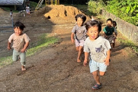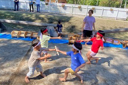かめ組は初めてのリレーです。以前は自分が走り終わると土で遊び出し自分のチームの勝負の行方を気にしない子がちらほら。「え?今どっち勝った?」と言っていたり、負けても「もう一回やろう!」が出ず、そのうちに、あららどこかへ遊びに行ってしまい続かないという事が多くありました。横のつながりを強くしていきたいなと思い、赤と白チームを固定し、続けていく中で少しずつ子どもたちに変化がみられるようになってきました。負けて悔し涙を流していたり「もう一回やるよ!」と友達に声をかけて集める姿も。年長が途中で泣きながら走っているのを見た円暉は「泣きながら走らない!」と訴えていましたよ。足が強くなりたいからと朝歩いてきた子がいると、自分も!と雨の中でも歩いて来たり、朝早起きして家の近くを散歩している子、和宇尻通りから坂を走って来る子…そんな姿が子どもたちに広がっていきました。