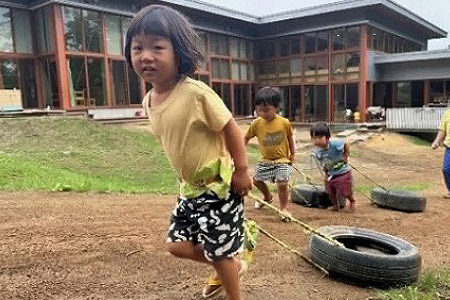 あさり組の障害物は、タイヤ引きをします。タイヤの重さは、6kg。この年齢になると斜めの姿勢がとれるようになり足腰の力もついてきます。たくさん引っ張って力をつけてほしいのですが青空と真白は、森で虫探しに夢中です。お昼ごはんの時も「食べたら虫とりにいこう。」と誘い合う仲です。虫の入っているバケツが大事で離せないのでタイヤの中にバケツを入れて引っ張りました。当日は、バケツなしで走ります。