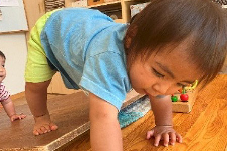 いくら組は障害物で戸板やすべり台を登ります。春から戸板でたくさん遊んで、今では板を出すとすぐに登って来るほど大好きな遊びになったんですよ。すべり台も人気で、一人が登ると次から次へとみんな登って大渋滞です。9月に入園したばかりの多咲も障害物競争に参加します。最近笑顔が出て来て、友だちにちょっかいを出す姿が見え始めています。最近ズリ這いをするようになった燦は色んな所へズリ這いで探検に行っています。