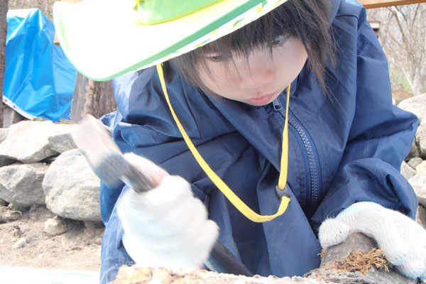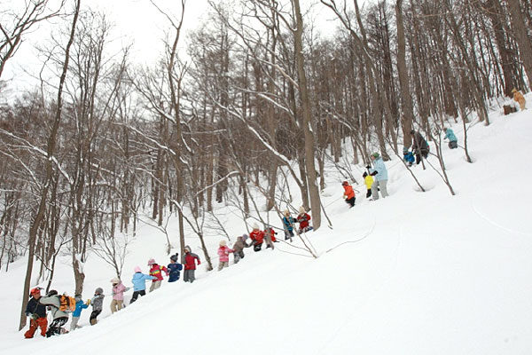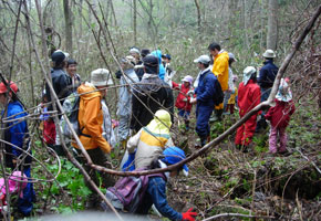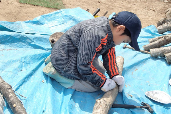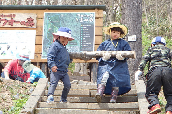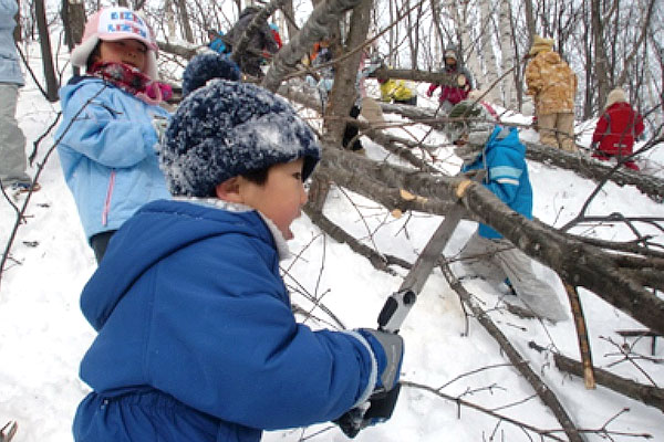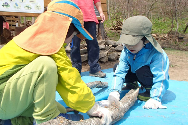 (ほだ木の山出しは、年長組が卒園直前に後輩への置き土産として行います)