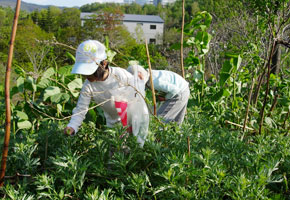 ・フキノトウ = 味噌和え ・ヨモギ = 天ぷら・もち ・ツクシ = おかか和え ・ヤマブドウ = ジュース・ジャム ・フキ = きゃらぶき・煮物 ・ミツバ = 汁物 ・ドドメ(ヤマグワの実) = ジャム・ジュース ・コクワ(サルナシ) = 生食